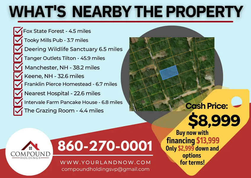 0.22 acres in Hillsborough County, New Hampshire EMERALD LAKE VILLAGE DISTRICT! INCREDIBLE BARGAIN! 0.22ac Hillsboro, NH Seller FINANCING (No Credit Check) at $13,999 with Only $2,999 Down BUY NOW for ONLY $8,999 CASH!! This 0.22-acre property would be the perfect spot for that weekend getaway any time of the year. The Emerald Lake Village District (ELVD) within the Town of Hillsborough, was established in 1979 for the community surrounding Emerald Lake, also known as Gould Pond. Originally a subdivision of seasonal homes, it has developed into primary homes for the majority of its residents. ELVD through a Board of Commissioners manages the well based water system, the beaches, and recreational areas, and approximately fourteen miles of roads. ELVD is also a community of people who enjoy the unique advantage of their own lake and beaches, as well as the proximity of Fox Forest, Pats Peak for skiing, and access to the shopping an...The Emerald Lake Village District (ELVD) within the Town of Hillsborough, was established in 1979 for the community surrounding Emerald Lake, also known as Gould Pond. Originally a subdivision of seasonal homes, it has developed into primary homes for the majority of its residents. ELVD through a Board of Commissioners manages the well based water system, the beaches, and recreational areas, and approximately fourteen miles of roads. ELVD is also a community of people who enjoy the unique advantage of their own lake and beaches, as well as the proximity of Fox Forest, Pats Peak for skiing, and access to the shopping and dining available in Hillsborough, while located close to Concord in the southwest part of New Hampshire. Fox State Forest (4.5 miles) was gifted to the State of New Hampshire by Caroline A. Fox in 1932 to maintain a research and demonstration station in Hillsborough. The Fox Forest Trust has provided funds to demonstrate proper scientific forestry, provide areas for applied forest research, provide programs on natural resource management, and develop a forest for public access and use. The forest encompasses 1,445 acres, the Henry I. Baldwin Forestry Education Center and a farmhouse/Headquarters. There is a well-developed trail system of about 22 miles that receive heavy, year-round use by hikers, cross-country skiers, snowshoers, hunters and mountain bikers. Chef Sean Burt realized his life-long dream of owning his own restaurant when in 1999 he opened Tooky Mills Pub and Restaurant (3.7 miles). Since then, "Tooky's" has become such a fixture in downtown Hillsborough that it seems like we've been here forever. Intervale Farm Pancake House (6.8 miles) opened their more than 30 years ago in Henniker, New Hampshire. They have been serving pancakes, waffles, eggs, and coffee from the same place on Flanders Road since that first day. Stop by and have breakfast with friends and family and become one of the regulars yourself! Enjoy delicious food by the Grazing Room (4.4 miles), Monthly Wine Dinners, Private Dining, Holiday Menus, Breakfasts, Takeout, and Bakery Orders. Bruce Barnes is a celebrated chef for The Grazing Room who has led all culinary operations at the World Bank in Washington, DC and owned two successful East Village restaurants. The Grazing Room is already receiving outstanding reviews and accolades for his expert culinary execution and varied menus. Deering Wildlife Sanctuary (6.5 miles) - In 1979, longtime conservationist and Audubon friend Ruth Crary Young donated 485 acres of her land to the Society after she accepted Audubons wildlife habitat management proposal. The gift was accompanied by an endowment to help support the basic maintenance of the property, which enables Audubon to fulfill its stewardship obligation and ensure the continued protection and preservation of this wildlife habitat for the enjoyment and enrichment of future generations. Shopping anyone top names are at these outlet malls: Tanger Outlets (45.9 miles), Merrimack Premium Outlets (51 miles), and Kittery Premium Outlets, Maine (82.3 miles). Maybe youd like to take in some history at The Franklin Pierce Homestead (6.7 miles). Franklin Pierce Homestead was the home of the 14th president of the United States from his infancy until his marriage in 1834. The Pierce Homestead is a fine example of New Hampshire village architecture. It is a two-story frame building with a hipped roof. Built by Pierce's father in 1804, it reflects the gracious and affluent living of the nineteenth century. A ballroom, which extends the entire length of the second floor, was used for entertaining neighbors and distinguished families of the state and nation. Franklin Pierce shared Daniel Webster's dedication to national unity and led our country during the most trying of times, the time of slavery. Private tours & large group tours can be arranged. The nearest hospital is Monadnock Community Hospital, which is only 22.6 miles from the property. This 0.22-acre property is being offered with seller financing (no credit checks!) at $13,999 with only $2,999 down OR for $8,999 CASH. The price is $13,999 if you need financing. The down payment required is $2,999 with either: 36 payment option of $370 x 36 months or 48 payment option of $295 x 48 months or 60 payment option of $250 x 60 months+ Show More