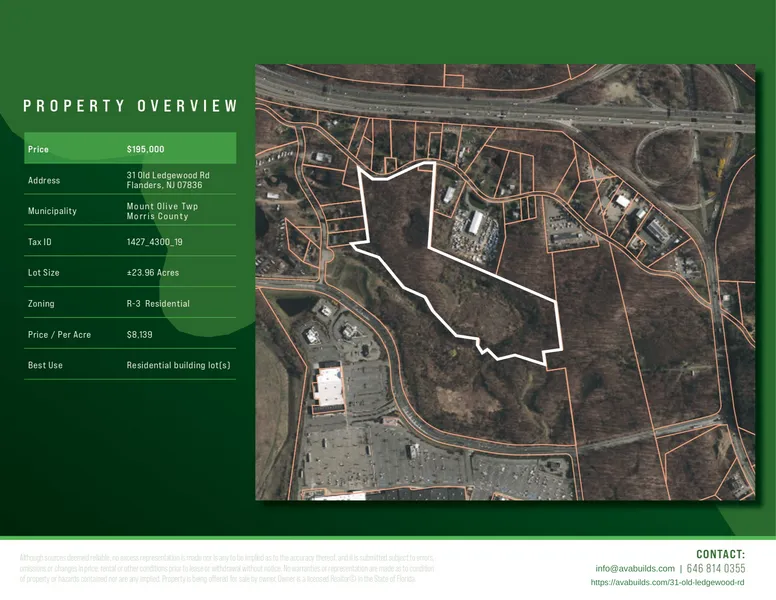 24 acres in Morris County, New Jersey PROPERTY OVERVIEW Price: $195,000 Address: 31 Old Ledgewood Rd Flanders, NJ 07836 Municipality Mount Olive Twp Morris County Tax ID: 1427_4300_19 Lot Size: 23.96 Acres Zoning: R-3 Residential Price / Per Acre: $8,139 Best Use Residential building lot(s) Please TEXT THE OWNER: 646 251-9990
