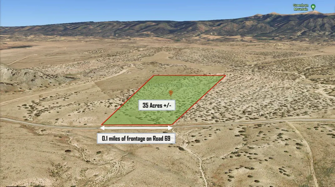 35 Acre Colorado Ranch With Highway 69 Road Frontage in Huerfano County 35 Acre Colorado Ranch With Highway 69 Road Frontage Message Us For A Full Drone Video Of The Property This 35 acres ranch property sits just a few miles south of the charming town of Gardner in the Southern Colorado foothills.. This property has stunning panoramic views of Gardner Butte and the Greenhorn Mountains. Out here you'll find a varied landscape consisting of open pastures, mature trees, and dramatic rock outcroppings. This lot features year round easy access with over 600 feet of road frontage along Highway 69. This property is surrounded by inspiring views of the Spanish Peaks,Sheep Mountain, Little Sheep Mountain,, Mount Mestas, Silver Mountain, Greenhorn Mountain and the Sangre de Cristo Mountain Range. Out here you'll also find access to the San Isabel National Forest. There is no time limit to build and no Hoa, Covenants/Restrictions. Many of the properties in Cl&G R...Many of the properties in Cl&G Ranch have cabins, homes, tiny homes, mobile homes, as well as manufactured homes. Per the Huerfano County Land Use Guidelines the minimum dwelling size is only 600 square feet. Mobile homes and manufactured homes are permitted as well. Pricing: $64,900 or $25k down and $750 x 80 Coordinates (Approx center - buyer to verify): 37.77750907,-105.1401107 Corner Coordinates (Approx - Buyer to verify): 37.77946,-105.14166 37.77551,-105.14180 37.77510,-105.13984 37.77915,-105.13754 Legal Description: Lot 57 Unit Aa Cl&G Ranch 371-873 383-966-967 385-37- 38-39-40-248-249-270 Tax: $71.32 Apn: 1713556 School District: Huerfano School District Re-1 Elementary School: Gardner Elementary School Middle School: Gardner Elementary School High School: John Mall High School How To Reserve This Property: Visit our website and place the $499 Holding Deposit + $249 Document Prep Fee. The holding deposit reserves the property for 5 business days, and the document prep fee allows us to draft the closing documents. Within the 5 business day window, we will either need to send the property to a Title Company / Abstractor or close on the property in-house (we can help facilitate either option). Please do not make the Deposit unless you are 100% certain you want to purchase this property. Once you make the payment, we will reach out via email/call to confirm which payment option you are going with. Some of these photos are from the surrounding area. DISCLAIMER: Any information provided in this communication is believed to be accurate, but in no way guaranteed. Buyer is responsible for verifying all information with the County as to what can and can't be done with the property. Buyer will need to work with the County to obtain the proper permits if needed. Buyer will also need to confirm the availability of any utilities needed or serviced on the property. Seller makes no warranties or representations about the land, its condition, or what can be built on the property. If/when you visit any of our properties, you are visiting at your own risk and release TLP - The Land Pioneer (and anyone associated) from any and all claims or liabilities.+ Show More